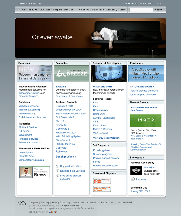 I was hired by Macromedia to redesign their website. I established the design language for all sections, including e-commerce.
