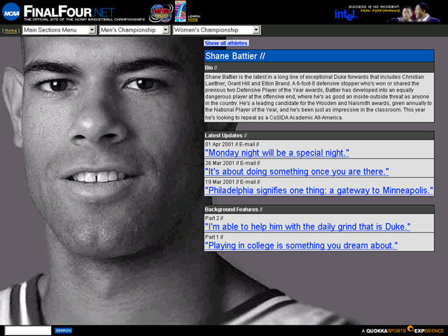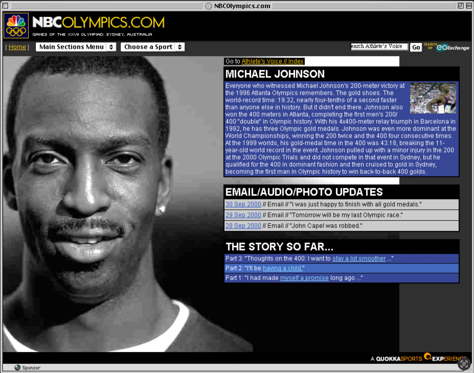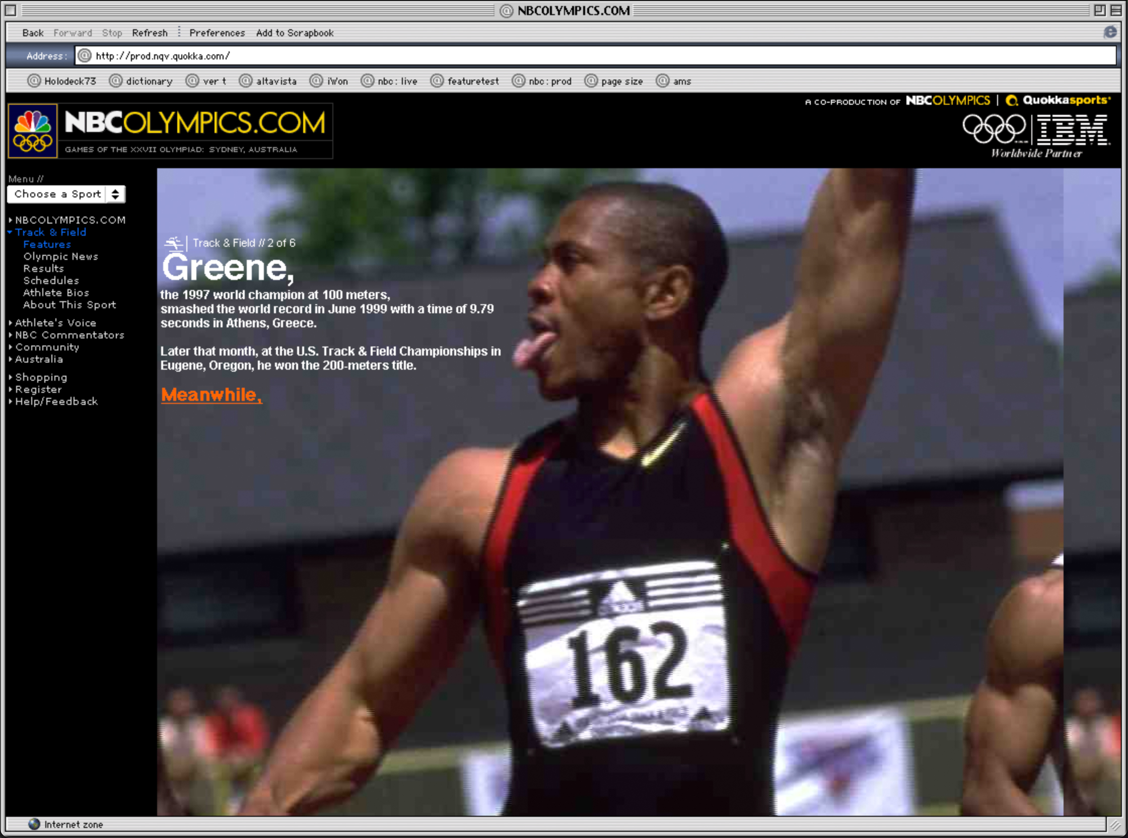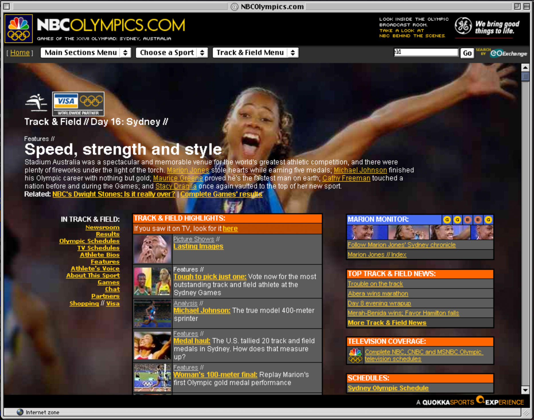 ⇢ Led design for the multi-award-winning NBC coverage of the Sydney Olympics, Salt Lake City Olympics, PGA Golf, CART Racing, NCAA Final Four, and more.