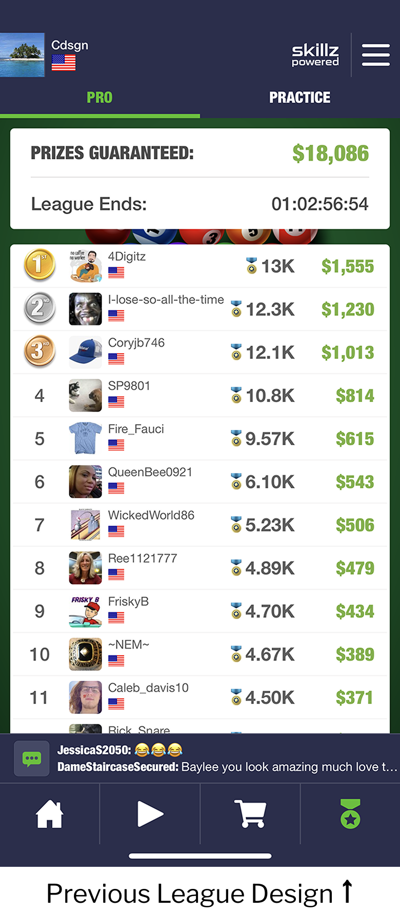 The Leagues feature across the platform was a single leaderboard where players competed for prizes. However, a list of thousands of players made it difficult for anyone but elite players to place high enough to win meaningful rewards.